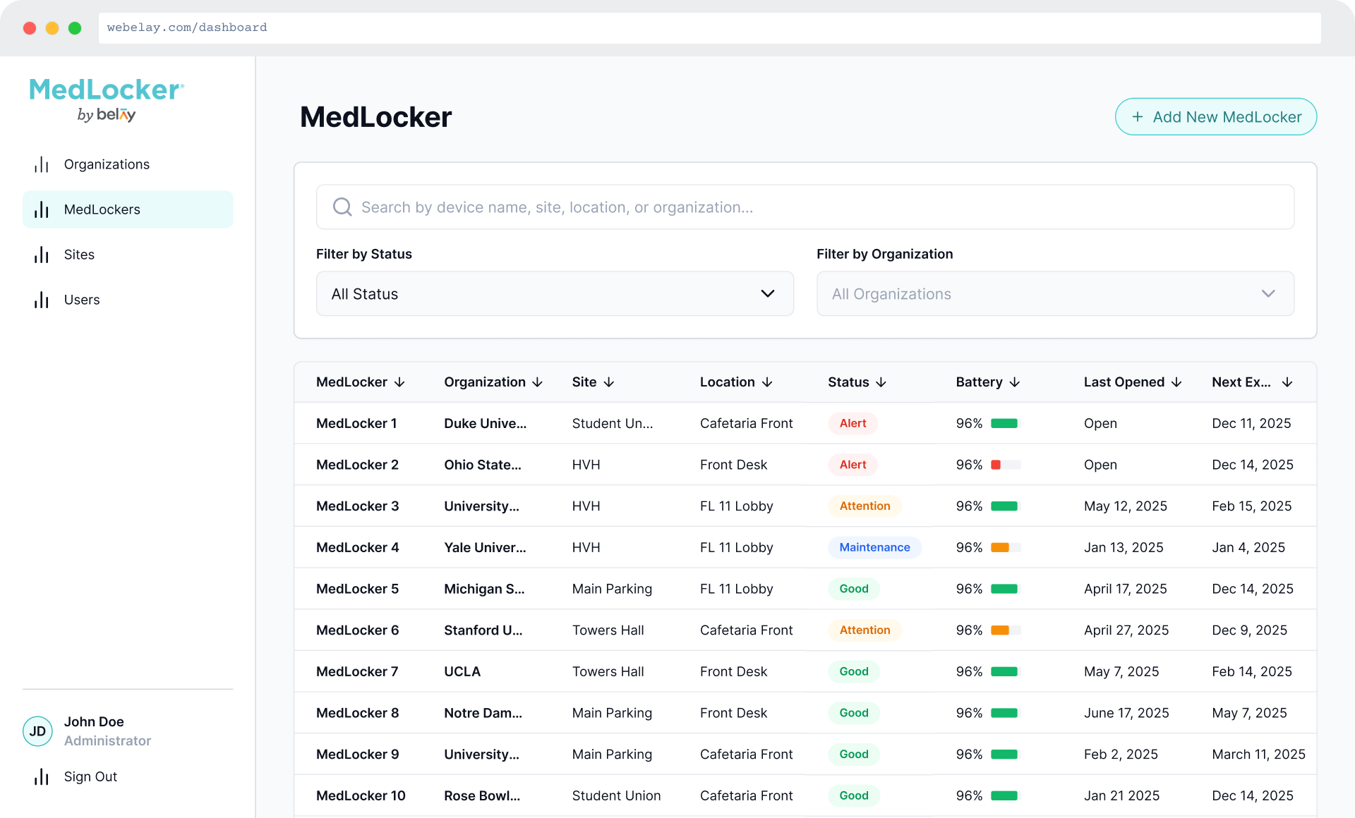 A campus responder opens the locker and uses a medication, an EpiPen, Narcan, or glucose gel. The system shows the locker's current status before they begin, including what's available and what isn't.