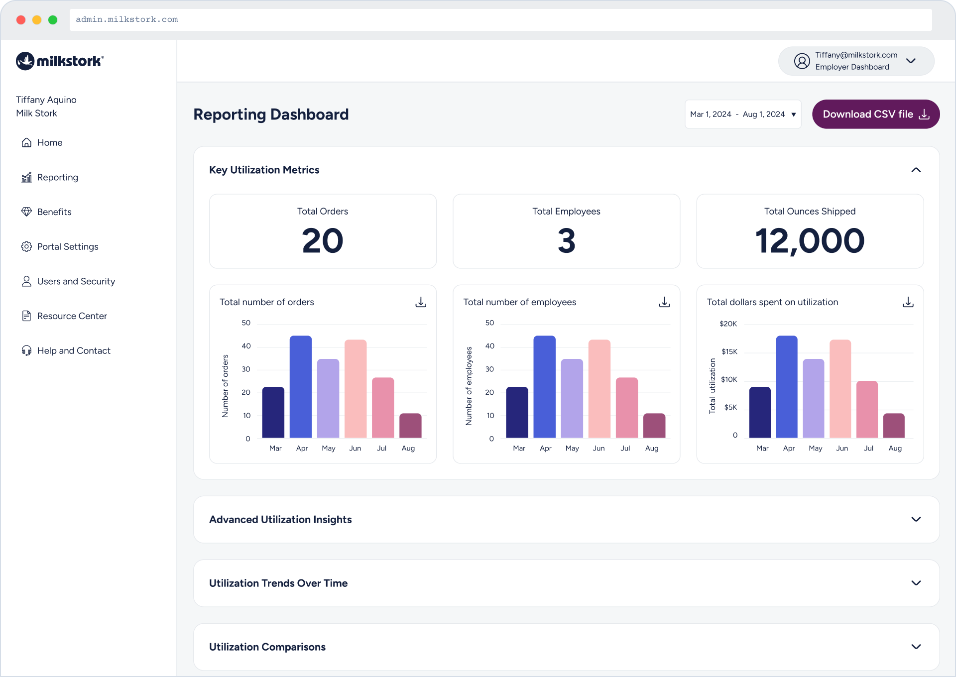 Designed across the full Milk Stork platform — admin dashboard, e-commerce shop, shipping workflows, and HR benefits tools serving Fortune 500 employers.